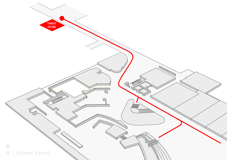 Follow the directions of the blue signage indicating the direction of the Thrift Store.