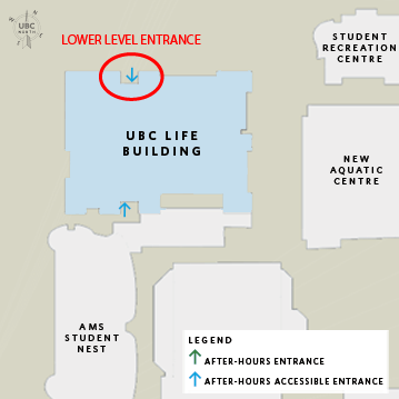 Enter the Life building through the lower level entrance that faces the North Parkade.